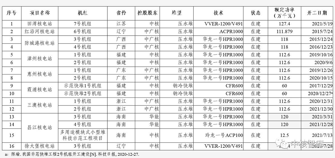 表2 我國大陸在建核電機(jī)組情況(截至2022年1月5日)