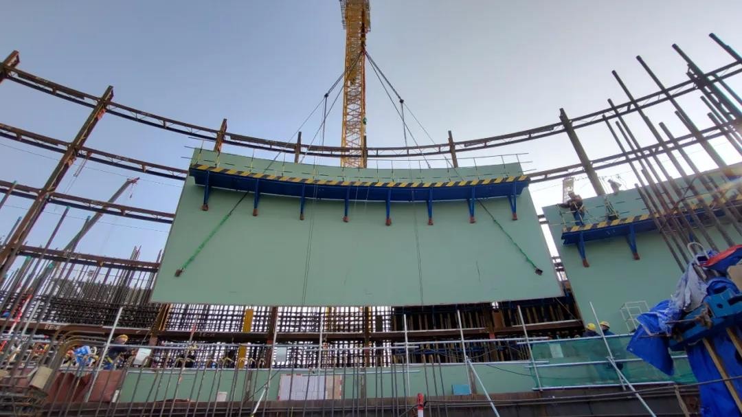 7號(hào)機(jī)組核島廠房安全殼鋼襯里-1.250m~+4.950m標(biāo)高段由42塊L形預(yù)應(yīng)力廊道襯里板和13塊半徑22米筒體鋼襯里板組成,總重68.5噸。中核華興多次組織召開中俄技術(shù)會(huì)議,深入研究,集思廣益,并結(jié)合現(xiàn)場施工實(shí)際不斷優(yōu)化施工工藝,改進(jìn)施工技術(shù),為后續(xù)吊裝奠定了堅(jiān)實(shí)的技術(shù)基礎(chǔ),更將為后期主設(shè)備引入及內(nèi)外安全殼混凝土施工贏得更多的時(shí)間窗口。