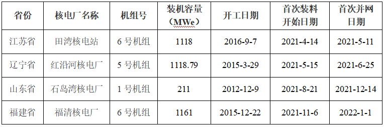▼表1:2021年1-12月首次裝料的核電機組信息