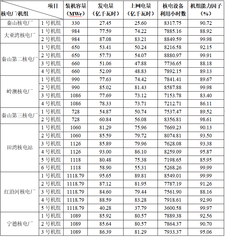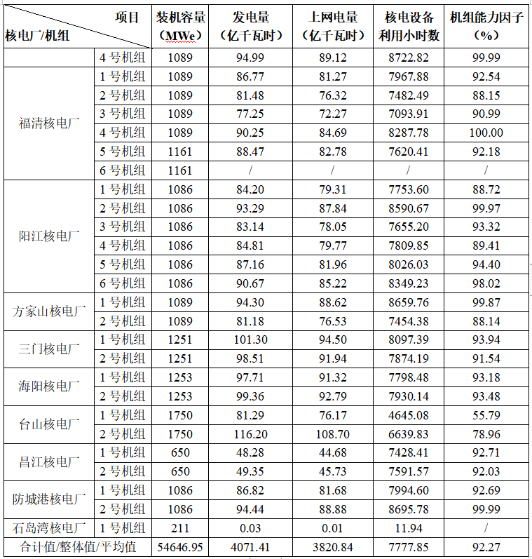 3)本表最后一行“合計值/整體值/平均值”中,裝機容量、發(fā)電量、上網(wǎng)電量為各機組合計值,核電設(shè)備利用小時數(shù)為全部機組整體值,機組能力因子為全部機組的算數(shù)平均值。