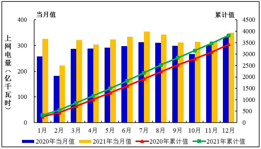 圖3:2020、2021年1-12月全國運行核電機組上網(wǎng)電量趨勢