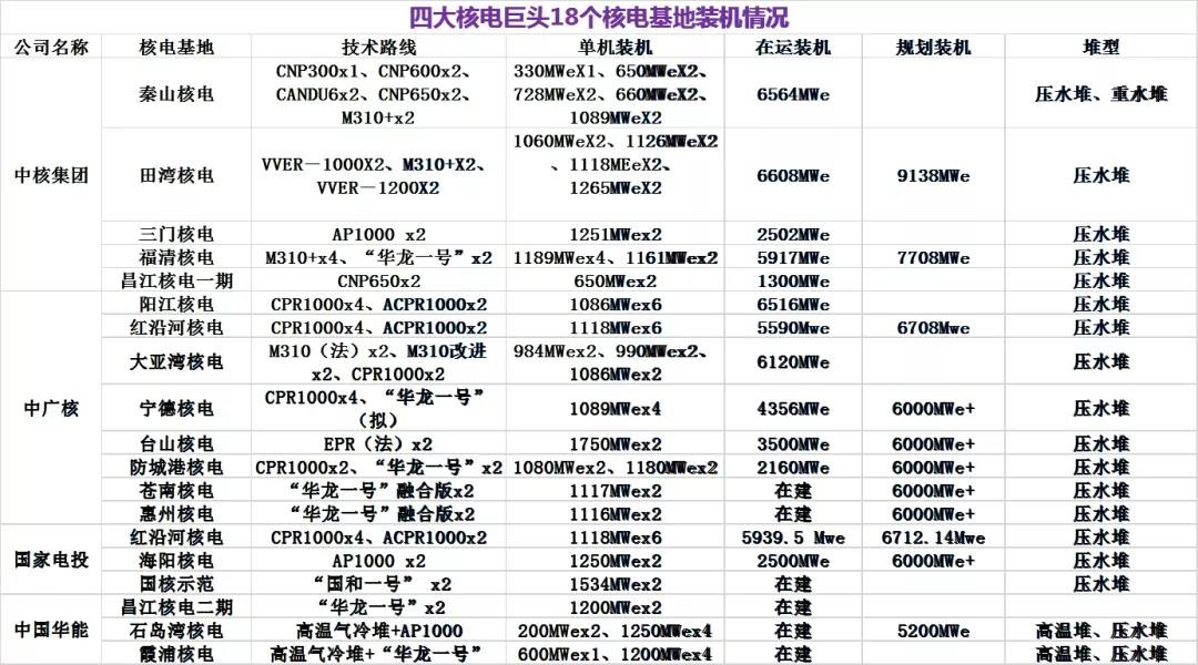 按照相應的布局、規劃,四大核電巨頭在八省區共形成了18個核電基地。公開資料顯示,中核集團自北向南建成了田灣、秦山、三門、福清和昌江五大核電基地。中廣核則坐擁廣東大亞灣、福建寧德、廣東陽江、惠州、浙江蒼南、廣東臺山、廣西防城港和遼寧紅沿河八個核電基地。