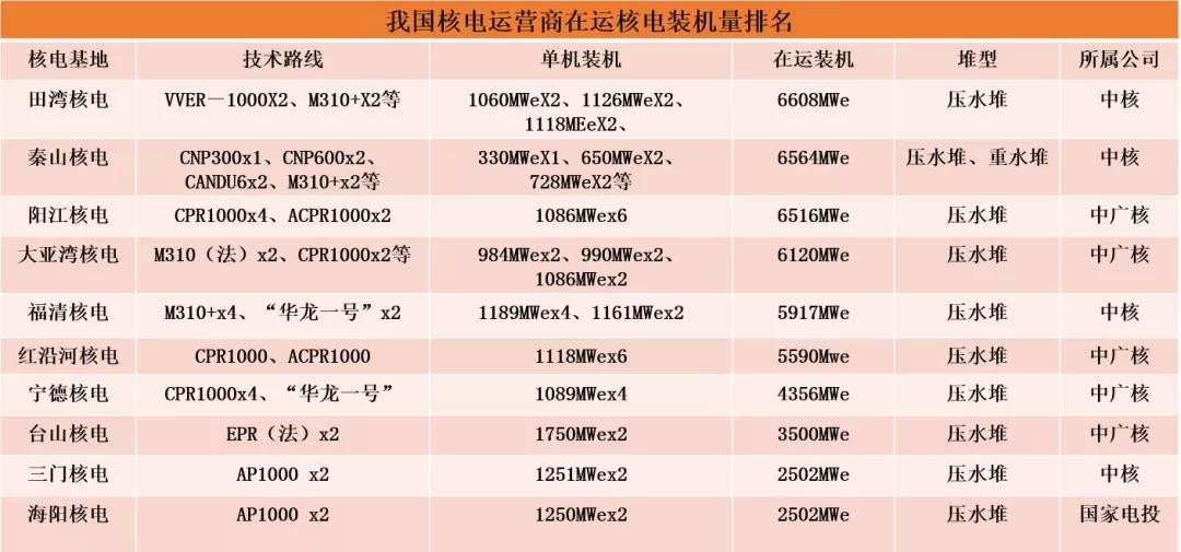 從在運裝機量方面看,中核集團秦山核電、田灣核電在運裝機量最大,排在三、四名的是中廣核陽江核電、大亞灣核電,排名第五的中核集團福清核電,接下來則是紅沿河核電、寧德核電和臺山核電。(深圳能博會)