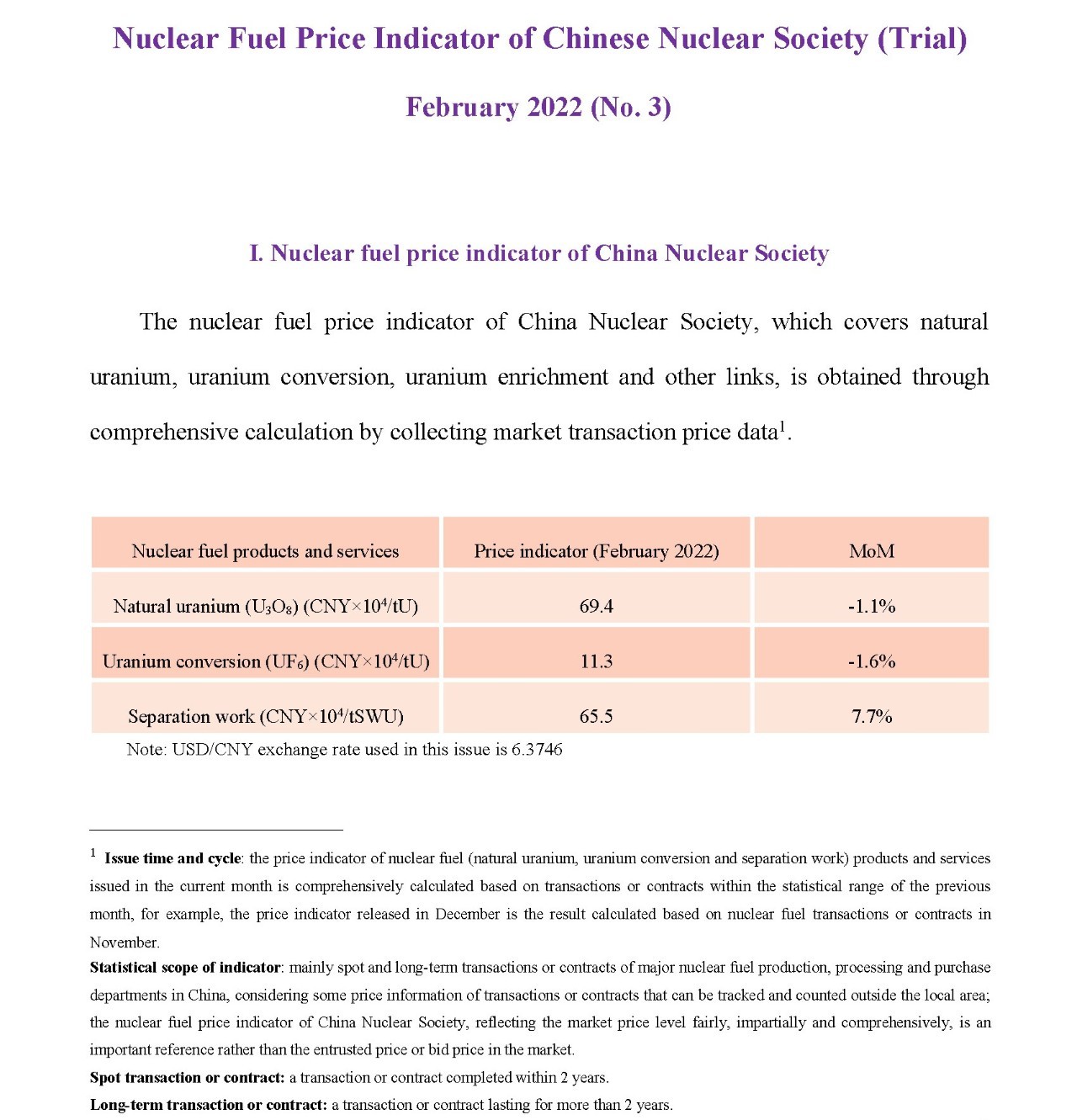 中國核學會核燃料價格指數(試運行)(2022年2月)