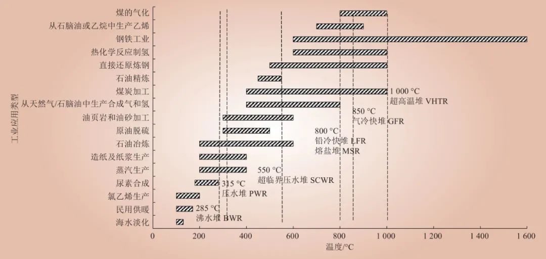 數(shù)據(jù)來(lái)源:文獻(xiàn)[15]圖2 不同反應(yīng)堆典型出口溫度及工業(yè)應(yīng)用所需溫度范圍