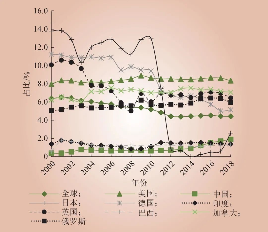截至2021年一季度末,全球在運(yùn)行核電機(jī)組444臺(tái),裝機(jī)容量3.94億kW;在建核電機(jī)組53臺(tái),裝機(jī)容量0.57億kW。2019年全球核能發(fā)電量占比約10.4%,在非化石能源中發(fā)電量占比約27.8%[5]。在經(jīng)濟(jì)總量排名靠前國(guó)家中,發(fā)達(dá)國(guó)家核能占一次能源消費(fèi)比例多年保持在4%~9%(見(jiàn)圖3,除法國(guó)占比高達(dá)約40%,德國(guó)決定棄核后核能占比明顯下降,日本受福島核事故影響核能占比下降以外)。截至2018年,這些國(guó)家的核電發(fā)電量占非化石能源發(fā)電量比例高達(dá)34%~52%[16]。