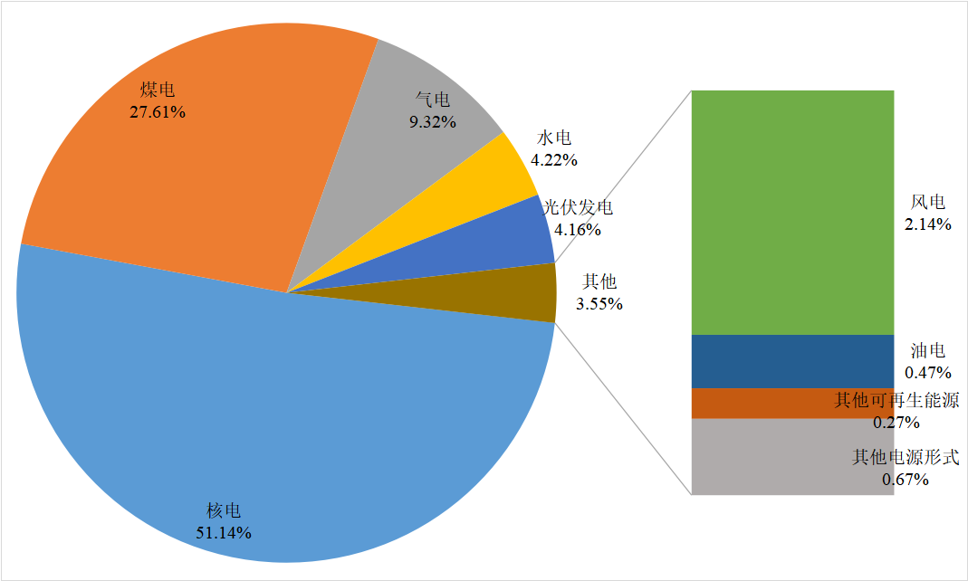 2020年,烏克蘭核電在國家電力結構中占比為51.14%,僅次于法國和斯洛伐克,位居世界第三位。2020年,烏克蘭總發電量為1490億千瓦時,分電源形式看,核電發電量為762億千瓦時,煤電為412億千瓦時,氣電為139億千瓦時,水電為63億千瓦時,光伏發電為62億千瓦時,風電為32億千瓦時,其他可再生能源為4億千瓦時,油電為7億千瓦時,其他電源形式為10億瓦時,人均年發電量為3420千瓦時。2020年,烏克蘭全社會用電量為1464億千瓦時,人均全社會年用電量3358千瓦時,同比我國人均全社會年用電量5320千瓦時。