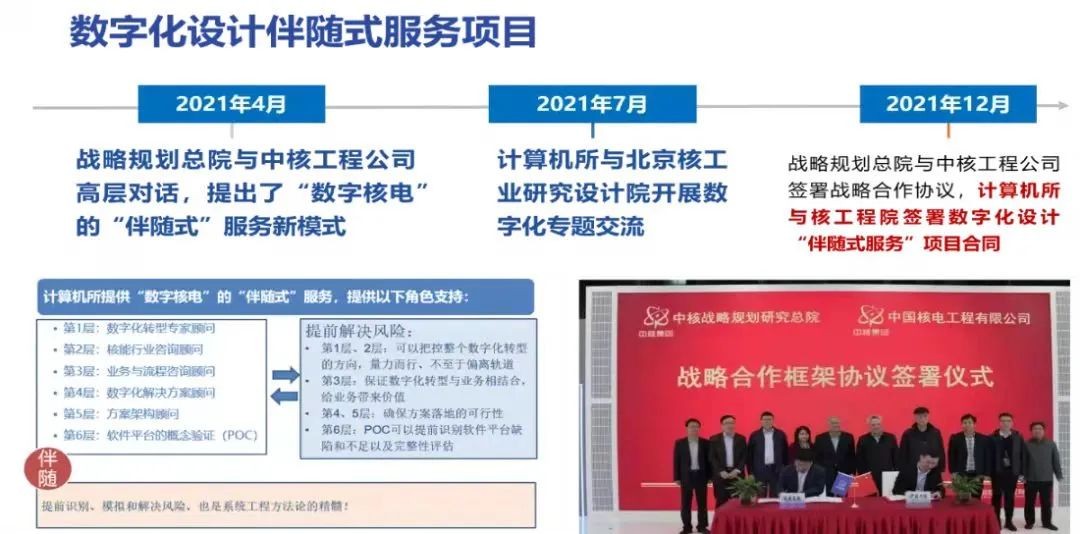 2021年12月,中國核電工程有限公司(以下簡稱中核工程)與中核戰略規劃研究總院有限公司(簡稱總院)簽訂戰略合作協議,協議中包含加強雙方在戰略規劃、數字化轉型等方面的專題研究和項目合作等內容。在此基礎上,作為總院所屬單位的中核核信(計算機所)與中核工程北京核工程研究設計院(以下簡稱北京核工院)簽訂數字化轉型“伴隨式服務”合同,開啟了雙方在數字化與系統工程轉型合作的新篇章。中核核信(計算機所)發揮自身專業特長,從源頭幫助把關數字化轉型的各個環節,在“伴隨式服務”中以滿足客戶數字化轉型需求為導向,以解決軟件技術、信息技術等問題為抓手,以實用性為立足點,提供了包含數字化轉型、培訓及數字化平臺建設等方面內容的咨詢服務,提供全方位全流程全周期的技術支撐。