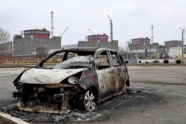 3月8日,烏克蘭扎波羅熱核電站周邊,一輛被燒毀的汽車。圖/人民視覺