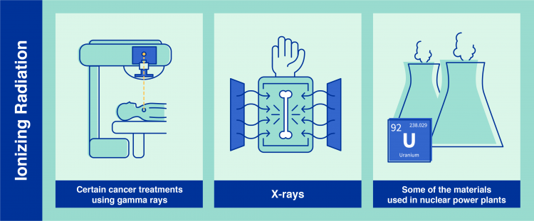 電離輻射的一些例子包括某些類型的癌癥治療,使用 X 射線和核電站中使用的放射性材料發出的輻射(信息圖:Adriana Vargas/IAEA)