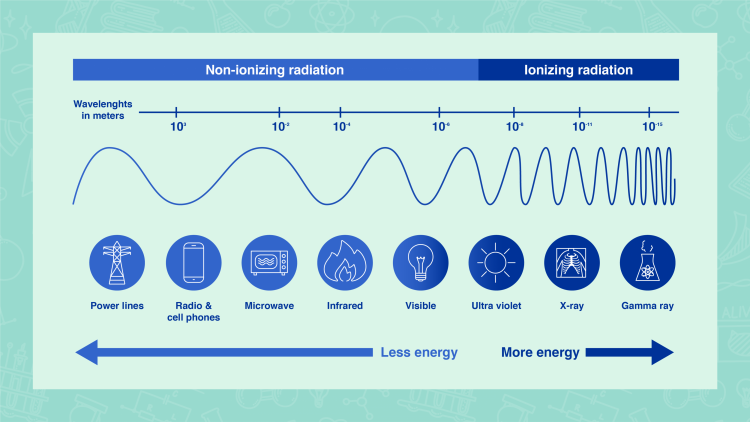 非電離輻射和電離輻射具有不同的波長,這與其能量直接相關。(信息圖:Adriana Vargas/IAEA)。
