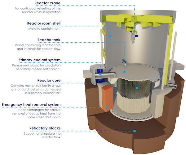 冷卻劑是另一種熔融鹽,在大氣壓力下運行,如果反應堆發生故障,該冷卻劑將永遠不會因衰變熱而沸騰。