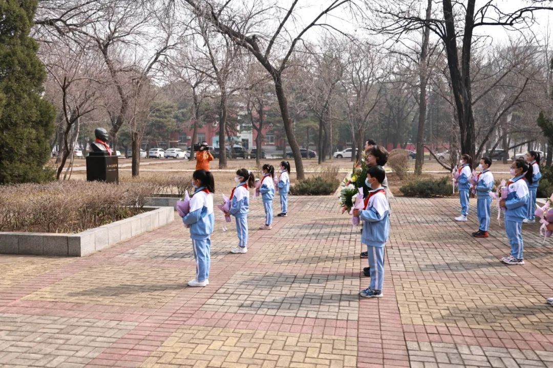 被深深感動和激勵的鞠萍姐姐、黃煒哥哥和小朋友們向兩位功勛的雕像敬獻紅領巾和鮮花,共同致敬不朽的功勛精神。