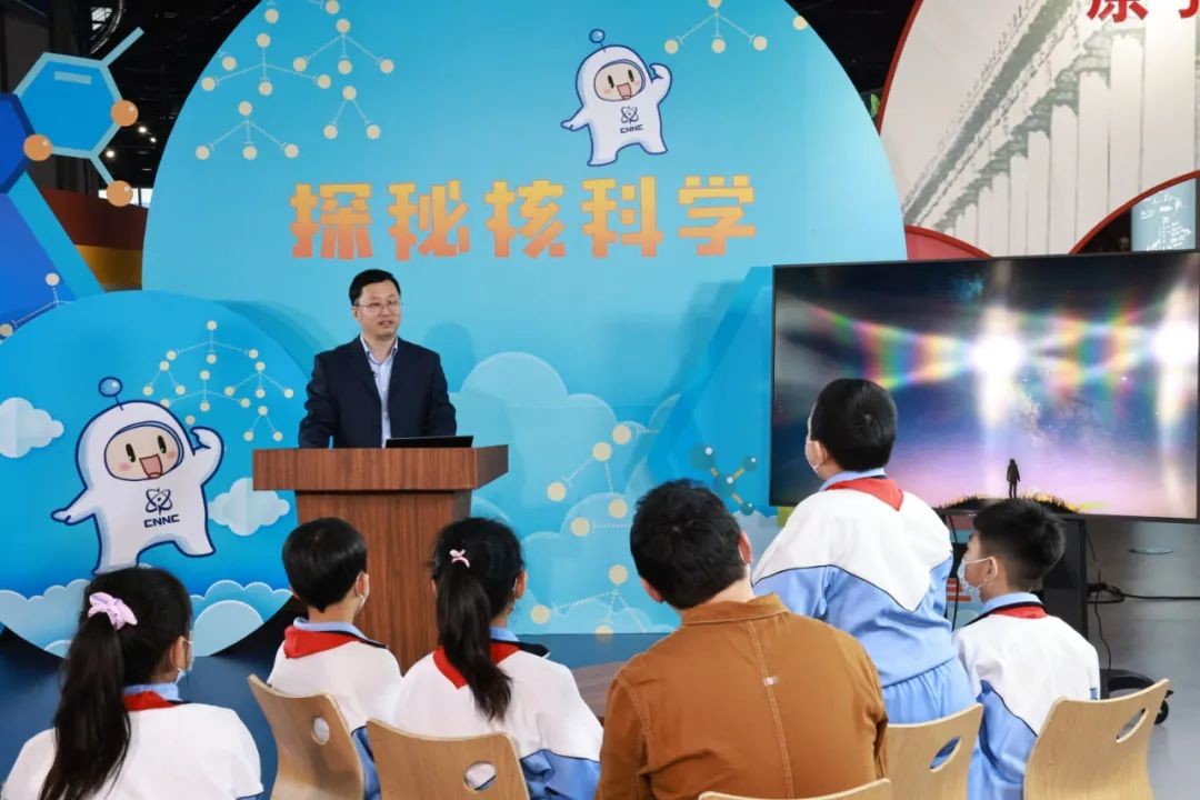 再往前走幾步,一個白色大模型深深吸引了小朋友們的注意力,它就是華龍一號的模型。“華龍一號是我國在30余年核電科研、設計、制造、建設和運行經驗基礎上研發的第三代核電技術,具有完整自主知識產權。”王蕾蕾說,“華龍一號單臺機組預計年發電量90億千瓦時,與同等規模燃煤電站相比,減少溫室氣體二氧化碳排放600萬噸,相當于造林3萬公頃,接近北京市海淀區的面積。”在形象的講解下,小朋友們更加切實地體會到核電是清潔、高效的能源,更是助力美麗中國建設的重要力量。