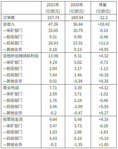 2022年2月25日,法國歐安諾公司(Orano)正式公布2021年年報。年報顯示,截至2021年底,歐安諾持有訂單總額為257.74億歐元,同比減少4.5%。歐安諾2021年總收入為47.26億歐元,同比增長28.3%;息稅折舊攤銷前利潤為13.98億歐元,同比增長50.2%。