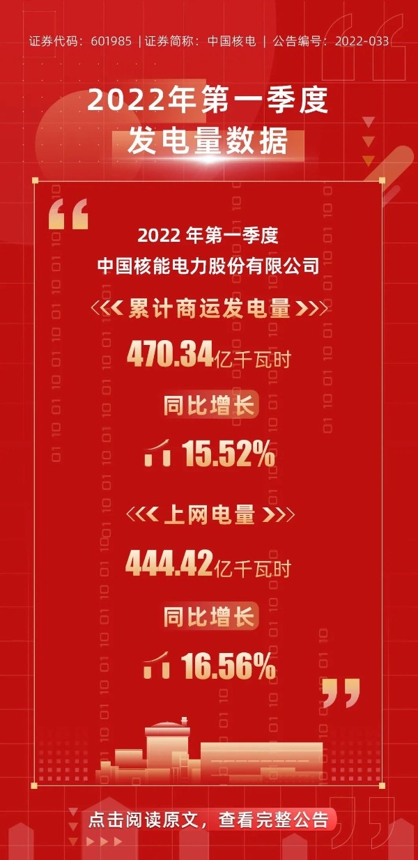 中國(guó)核電2022年一季度累計(jì)商運(yùn)發(fā)電量470.34億千瓦時(shí),同比增長(zhǎng)15.52%