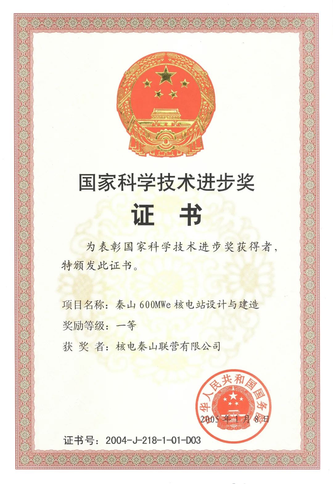 2005年1月8日,《秦山600MWe核電站設計和建造》項目榮獲“國家科學技術進步獎一等獎”。