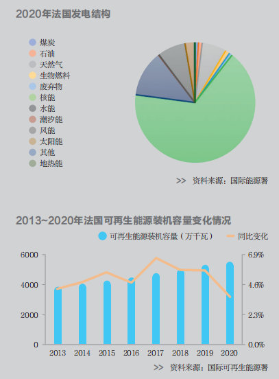 在2019年的《能源和氣候法》中,法國承諾在2022年關閉其剩余的燃煤電廠,并根據電力需求的變化,在2035年之前關閉14座核反應堆,使核能在其電力結構中的份額達到50%,同時使可再生能源發電量增加近兩倍。