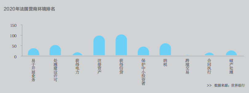 根據《2020年營商環境報告》,法國的營商環境位列全球第32名,處于靠前位置。其中,法國跨境交易全球第一,此外在獲得電力和易于開展業務方面排名靠前,但在注冊資產和獲得信貸方面較為靠后。