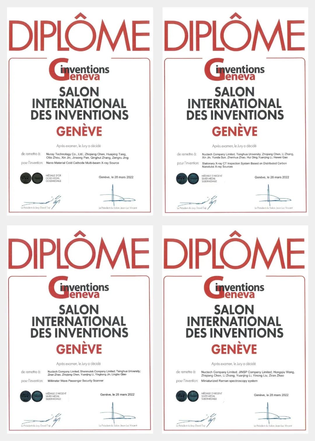 日內瓦國際發明展創辦于上世紀的1973年,由瑞士聯邦政府、日內瓦州政府、日內瓦市政府、世界知識產權組織共同舉辦,是全球舉辦歷史最長,規模最大的發明展之一。受疫情影響,今年多個國家地區的發明以線上方式參展。2022年3月16日-20日國際專家團隊對來自40多個國家和地區的數千項發明進行審核,經過專家評審等多個環節,同方威視碳納米管冷陰極分布式X射線源、基于碳納米管分布式X射線源的安檢靜態CT智能查驗系統、毫米波人體安全檢查儀、小型化拉曼光譜系統等核心技術成果從中脫穎而出。