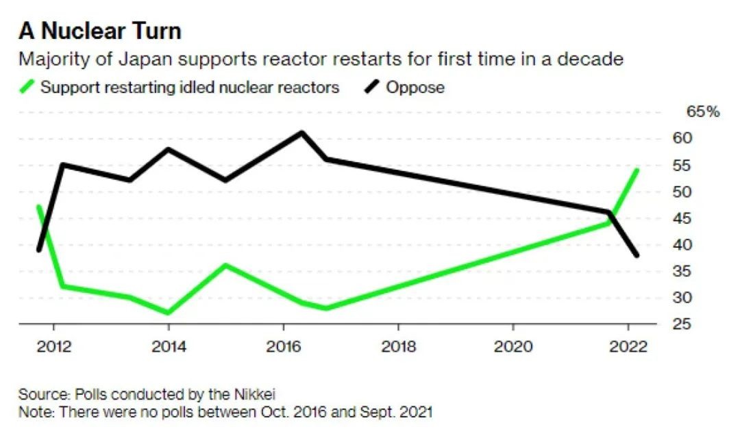 《日經新聞》對重啟核電支持率的調查結果,10年來首次支持者超過反對者 來源:《日經新聞》