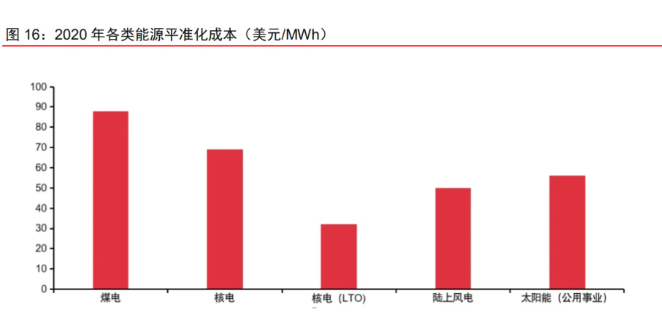制氫:國際原子能機構研究表明,當天然氣價格遠高于過去十年普遍較低的水平時, 核能將是生產清潔氫氣的最具成本效益的手段。充足的核電供應可以降低制氫成本,使用 核電站電力生產的“黃氫”將在氫能經濟發展中發揮關鍵作用。相關研究顯示,歐盟和美 國利用目前常規反應堆生產氫,成本約為 3 美元/千克。亞洲大型反應堆生產氫的成本不到 2 美元/千克。而新型先進模塊化反應堆進行大規模生產氫的成本或降至 1 美元/千克。2021 年 2 月,英國核工業委員會(NIC)達成《氫能路線圖》,到 2050 年,核能可以生產英國三 分之一的清潔氫需求。
