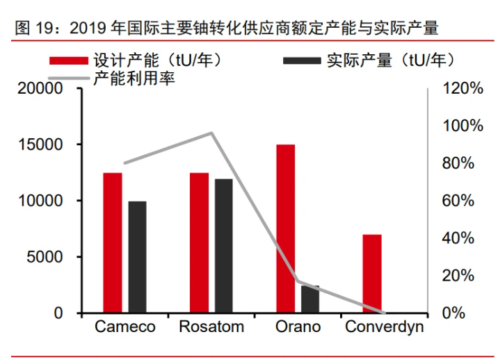 國際上共有 4 家大型商業鈾轉化服務一次供應商:加拿大礦業能源公司(Cameco)、 俄羅斯國家原子能集團公司(Rosatom)、法國歐安諾集團(Orano)與美國康弗登公司 (Converdyn)。在日本福島核事故后,全球新增核電裝機速度不及預期,國際核燃料市場 連續多年供大于求,市場價格長期進入下行通道,市場競爭日益激烈,先進核燃料供應商 相繼暫停或延緩了新建產能計劃。2011 年起 Cameco、Rosatom 與 Converdyn 分別逐 年降低了各自的產能。全球市場二次供應的來源主要包括三個方面,分別為政府庫存、鈾 濃縮廠與商業庫存。