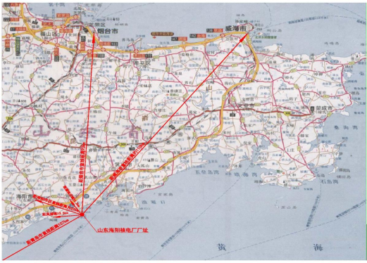 廠址距海陽市核電裝備制造工業區管委會約4.0km(廠址N方位);距留格莊鎮約10.2km(廠址NW方位);距鳳城街道辦事處約13.5km(廠址W方位);距海陽市市區(海陽市政府)直線距離約22km(廠址NW方位);距煙臺市直線距離約93km(廠址N方位);距青島市直線距離約103km(廠址SW方位),距威海市直線距離約110km(廠址NE方位)。