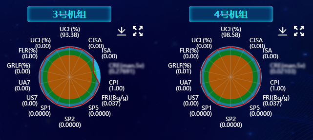 結(jié)果型指標(biāo)選取WANO綜合指數(shù)和10個(gè)單項(xiàng)業(yè)績(jī)指標(biāo), WANO指數(shù)作為世界范圍內(nèi)核電機(jī)組運(yùn)行業(yè)績(jī)排名的重要依據(jù),用來衡量核電業(yè)績(jī)。結(jié)果型指標(biāo)通過雙色燈牌動(dòng)態(tài)展示1-6號(hào)機(jī)組10項(xiàng)單項(xiàng)指標(biāo)結(jié)果和指標(biāo)狀態(tài),雷達(dá)圖實(shí)現(xiàn)多維信息集成展示、橫向?qū)Ρ龋瑸楦骷?jí)管理層全面掌握機(jī)組運(yùn)行情況以及下一階段優(yōu)化方向提供決策依據(jù)。