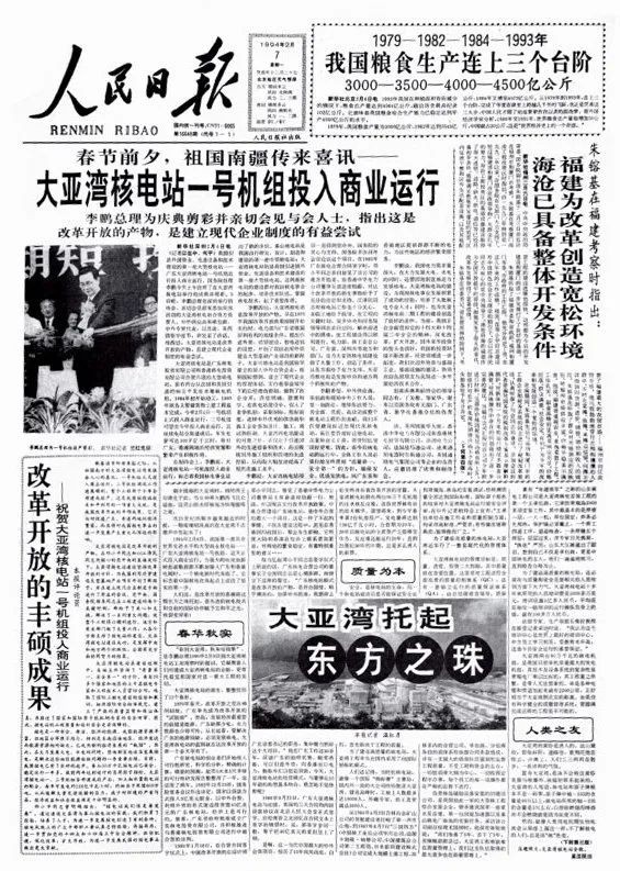 ▲1994年2月7日,大亞灣一號(hào)機(jī)組商運(yùn)的新聞登上了《人民日?qǐng)?bào)》頭版頭條。