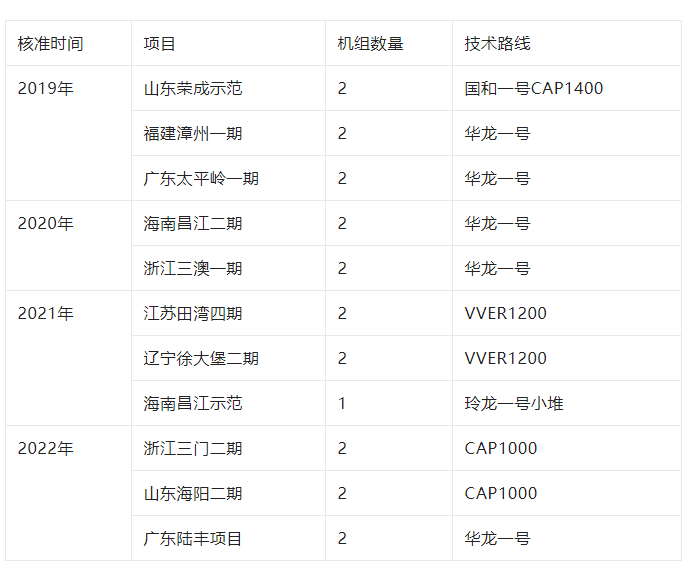 從2019年至今,我國共核準新核電項目11個,合計21臺機組(見圖表)。按技術分,華龍一號項目6個,AP/CAP項目3個,國外技術項目2個,小堆項目1個;按項目歸屬企業分, 中核集團5個,中廣核3個,國家電投2個,華能1個;按反應堆類型分,大型壓水堆項目10個,模塊化小型壓水堆項目1個。