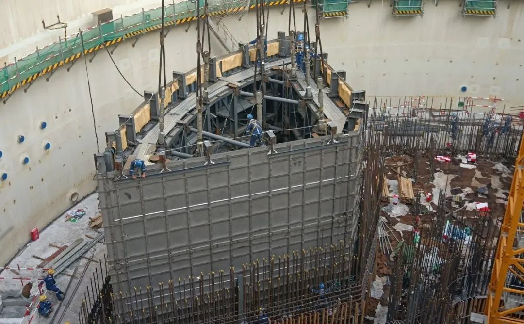 2022年4月28日17時28分,歷時2小時,非能動堆腔注水箱不銹鋼覆面模塊一吊裝就位,保證了后續(xù)反應堆廠房內(nèi)部結構的連續(xù)施工。
