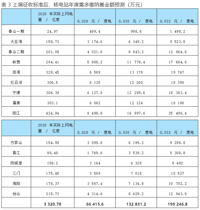 將征收標(biāo)準(zhǔn)從現(xiàn)行的 0.026 元 / 度電分別提高到 0.028 元 / 度電、0.030 元 /度電和 0.032 元 / 度電,以 2020 年實際上網(wǎng)電量為例,預(yù)測壓水堆核電站年度需多繳納的基金額(見表 3)。