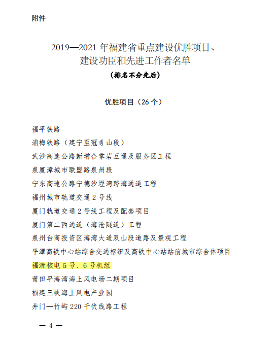 近日,福建省人民政府發文表彰,決定授予福清核電5號、6號機組等26個項目為2019-2021年福建省重點建設優勝項目,授予福清核電調試管理/生產準備處處長龔智明等29名同志為福建省重點建設項目“建設功臣”。