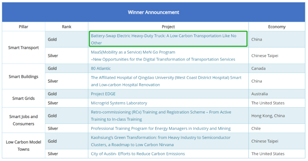橫跨大半個(gè)地球,經(jīng)過近五個(gè)月的角逐,第五屆 APEC ESCI 最佳實(shí)踐獎結(jié)果終于揭曉:國家電投“換電重卡 一 正在推動中國重型卡車運(yùn)輸?shù)闹腔鄣吞嫁D(zhuǎn)型”(Battery-Swap Electric Heavy-Duty Truck:A Low Carbon Transportation Like No Other) 項(xiàng)目從來自澳大利亞、加拿大、美國等17個(gè)經(jīng)濟(jì)體的65個(gè)項(xiàng)目中脫穎而出,一舉榮獲智慧交通金獎。