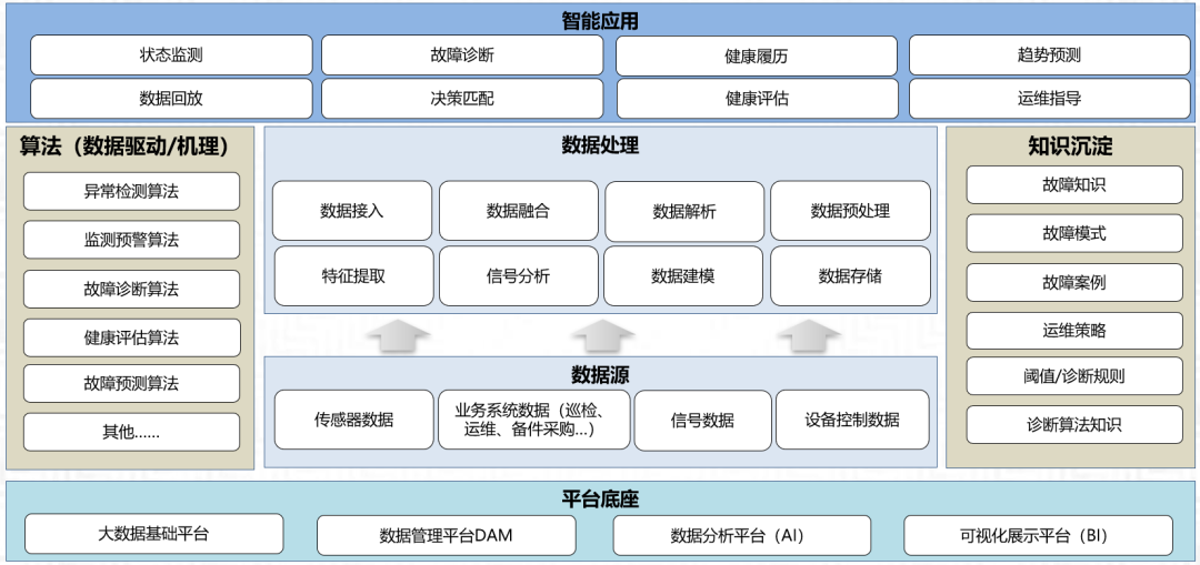 平臺(tái)采用混合式大數(shù)據(jù)架構(gòu),支持?jǐn)?shù)據(jù)實(shí)時(shí)接入與海量存儲(chǔ),實(shí)現(xiàn)設(shè)備運(yùn)行狀態(tài)數(shù)據(jù)、故障記錄、診斷報(bào)告等有效管理。平臺(tái)提供設(shè)備數(shù)據(jù)全生命周期管理體系、三級(jí)預(yù)警規(guī)則監(jiān)測(cè)體系、故障智能診斷與預(yù)測(cè)體系、決策優(yōu)化與知識(shí)沉淀體系,全面支撐核電設(shè)備運(yùn)行狀態(tài)監(jiān)測(cè)、故障診斷、健康評(píng)估、故障預(yù)測(cè)、輔助維修和綜合信息管理推送等應(yīng)用。