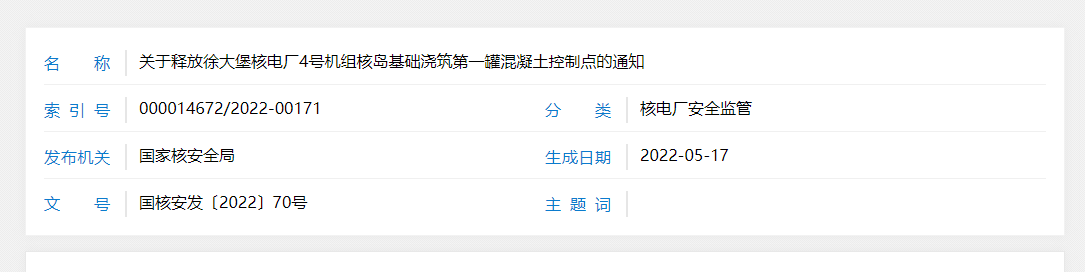 根據《中華人民共和國核安全法》《中華人民共和國民用核設施安全監督管理條例》的有關規定,我局對你公司提交的徐大堡核電廠4號機組核島基礎澆筑第一罐混凝土前準備情況核安全檢查管理要求整改報告進行了核查。結果表明,徐大堡核電廠4號機組目前已具備核島基礎澆筑第一罐混凝土(FCD)條件,我局同意釋放徐大堡核電廠4號機組FCD控制點。你公司在確認相關物項和活動滿足4號機組FCD的要求,并經生態環境部東北核與輻射安全監督站確認后,可以進行徐大堡核電廠4號機組核島基礎混凝土澆筑活動。