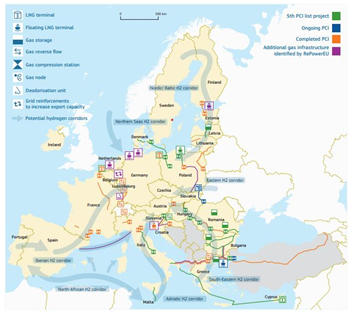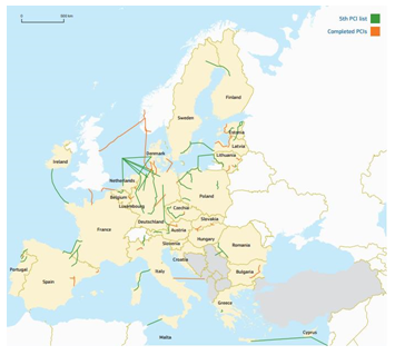 實現(xiàn)《賦能計劃》目標,到2027年需要額外投資2100億歐元,到2030年需要投資3000億歐元。歐盟將通過投資大力推進名為“跨歐洲能源網(wǎng)絡”的天然氣基礎設施建設(如圖2所示),并將加快電網(wǎng)基礎設施建設,以改善歐盟跨境電力互連網(wǎng)絡(如圖3所示)。對于資金來源,歐盟委員會希望各成員國利用歐盟總額為8000億歐元的“新冠疫情復蘇和彈性基金”(簡稱“RRF基金”)。目前,RRF基金能夠以貸款形式為《賦能計劃》的執(zhí)行提供2250億歐元的資金。對于余下的資金需求,歐盟表示未來幾年可通過出售額外的碳市場許可籌集到200億歐元。