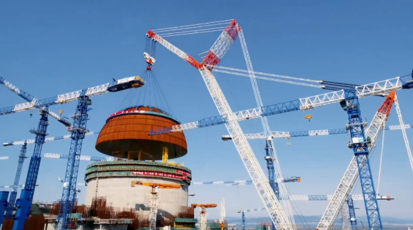 穹頂?shù)跹b是核電工程建設(shè)的重要節(jié)點(diǎn),也是難度最高的環(huán)節(jié)之一。“華龍一號(hào)”的穹頂為直徑46.8米的半球體,高23.4米,穹頂及配套繩索總重超過(guò)500噸,如此龐然大物要整體吊裝至45米高的核反應(yīng)堆堆頂上,難度可想而知。
