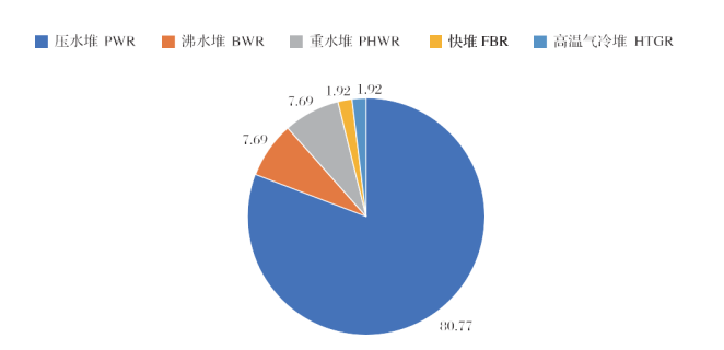 截至 2020 年年底,世界在建核電機組 53 臺,分布在 19 個國家或地區,總裝機容量 56 393 兆瓦(見圖 3)。在建反應堆大部分為壓水堆,數量占到 80.77%(見圖 4)。中東、中亞等地區已經成為新的核電建設主要區域。未來全球核電建設的重點將應在發展中國家,尤其是中國和印度,發達國家趨于維持現有核電水平。