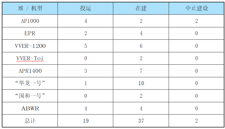 目前,已 經實現商業部署的三代核電技術有 AP1000、EPR、VVER、APR1400、“華龍一號”和 ABWR 等 6 種堆 / 機型。其中,建成的機組 19 臺,在建的機組 37 臺,中止建設的機組 2 臺(見表 2)。