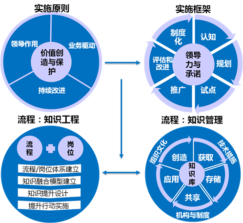 中核工程遵循“領導作用、業務驅動、知識創新”的總原則,致力于價值創造與保護,以“領導力與承諾”為核心,采用“六步走”實施路徑,即認知、規劃、試點、推廣和支持、評估和改進以及制度化。為逐級實現知識資產化與知識場景化,對標先進企業知識管理實踐與GB/T 23703-2014《知識管理》,中核工程知識管理體系建設堅持兩條主線并行推進,分別為“以知識庫為基礎的知識管理”和“基于流程、崗位的知識工程”。