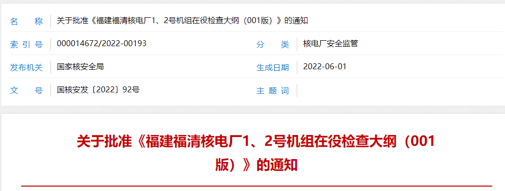根據《中華人民共和國核安全法》《中華人民共和國民用核設施安全監督管理條例》的有關要求,我局對你公司提交的申請文件進行了技術審評,認為你公司《福建福清核電廠1、2號機組在役檢查大綱(001版)》是可以接受的,現予批準。