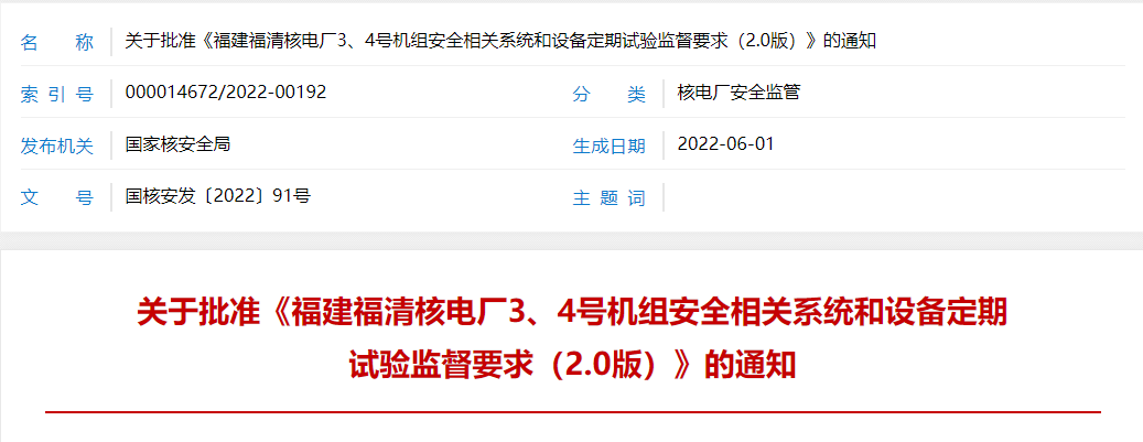 根據《中華人民共和國核安全法》《中華人民共和國民用核設施安全監督管理條例》的有關要求,我局對你公司提交的申請文件進行了技術審評,認為你公司《福建福清核電廠3、4號機組安全相關系統和設備定期試驗監督要求(2.0版)》是可以接受的,現予批準。