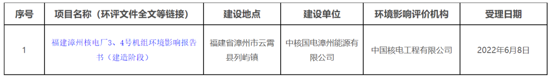 6月9日,生態環境部發布《關于2022年6月8日建設項目環境影響評價文件受理情況的公示(核與輻射)》,內容為福建漳州核電廠3、4號機組環境影響報告書(建造階段)公示。