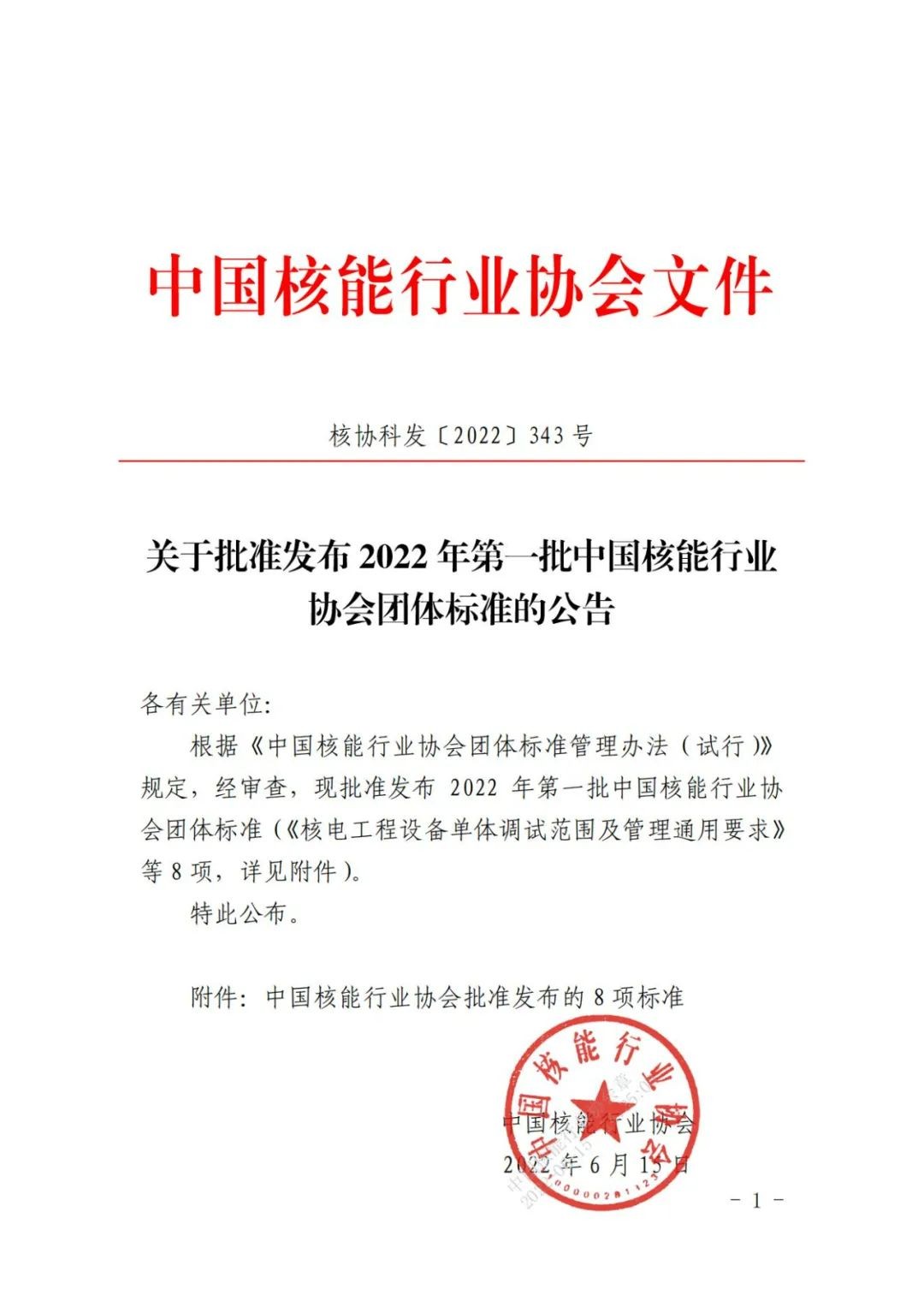 關于批準發布2022年第一批中國核能行業協會團體標準的公告