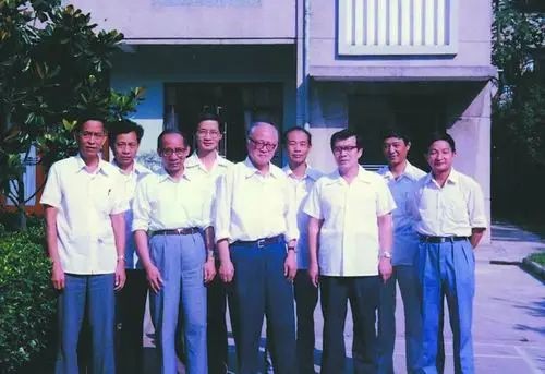 (前排左起:鄧錫銘、干福熹、王淦昌、王世績、余文炎)。