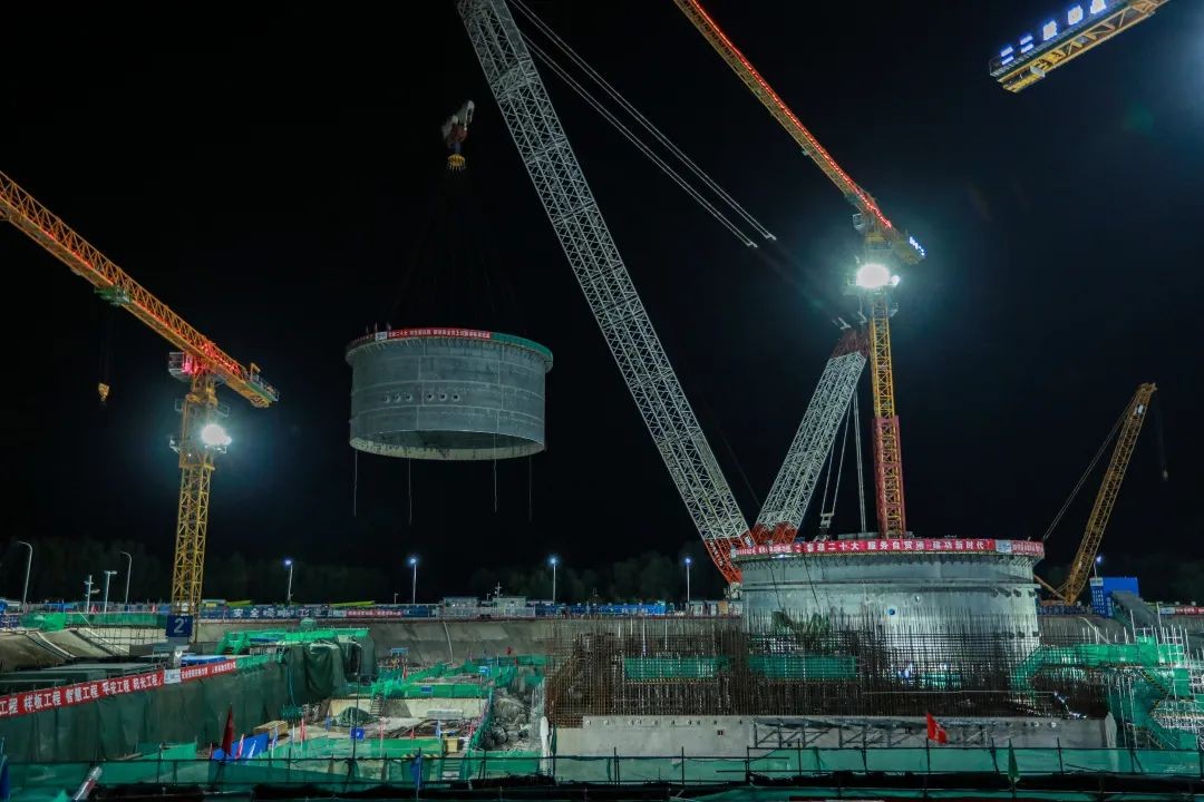 2022年7月5日22點32分起吊,6日0:08分全球首堆“玲龍一號”反應堆廠房鋼制安全殼上部筒體順利吊裝就位,比計劃提前70天完成進度目標,為高質量推進小堆工程建設奠定了堅實基礎。“玲龍一號”工程建設進展順利,標志著我國在小型模塊式壓水堆開發與利用方面走在了世界前列。