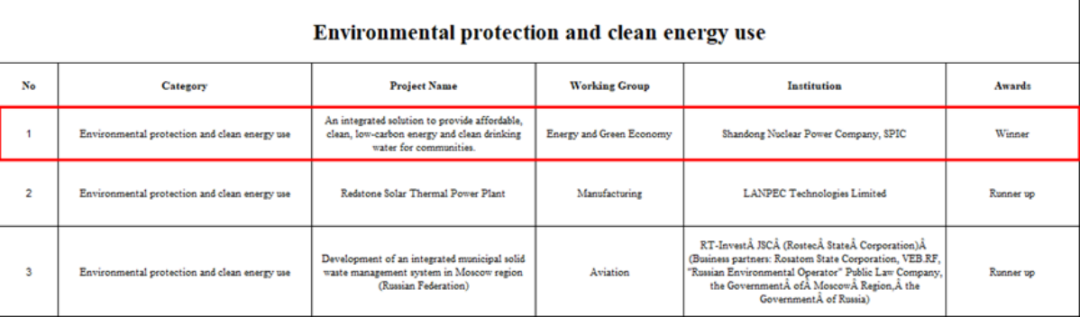 本次大賽共收集案例140余項,多國企業(yè)積極參賽,經(jīng)過評審團(tuán)認(rèn)真評選,國家電投海陽核電“核能+水熱同產(chǎn)同傳及綜合智慧能源”項目作為一種為社區(qū)提供可負(fù)擔(dān)的清潔低碳能源和清潔飲用水的綜合解決方案,參選“環(huán)境保護(hù)及清潔能源使用”組并斬獲優(yōu)勝獎(Winner),為該組別最高獎項。