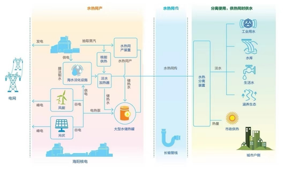 國家電投“核能+水熱同產(chǎn)同傳及綜合智慧能源”項目是《中華人民共和國國民經(jīng)濟(jì)和社會發(fā)展第十四個五年規(guī)劃和2035年遠(yuǎn)景目標(biāo)綱要》中“開展山東海陽等核能綜合利用示范”的重要組成部分。作為世界首個核能+水熱同傳項目,國家電投海陽核電聯(lián)合清華大學(xué)等高校及設(shè)計研究院所,基于清華大學(xué)等研發(fā)的水熱同產(chǎn)專利技術(shù),共同研制成功并實施了世界首套水熱同產(chǎn)同傳系統(tǒng)。